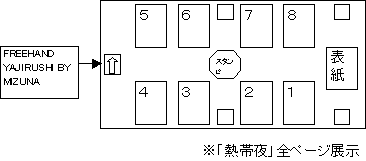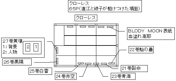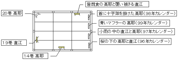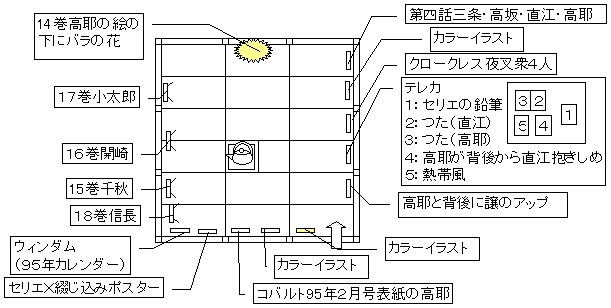 | ◆浜田翔子さんの展示場その2−−−b ・薔薇の花があった?(20巻の下) ・「桜の下の高耶と直江(96年カレンダー)」はaの部屋ではなくこの部屋だった? ・20巻の近くに「19巻直江」がイーゼルであったが位置不明。 ・図解の黄色は位置に自信がないものです。 |